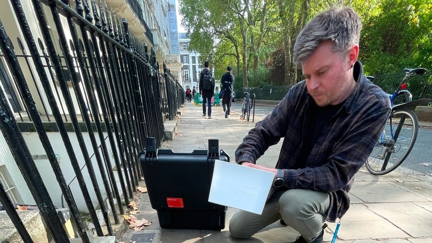 การใช้ Artec Leo เพื่อบันทึกภาพแผ่นปูถนนที่มีรอยหยักคล้ายฟอสซิล ภาพจาก Birkbeck มหาวิทยาลัยลอนดอน