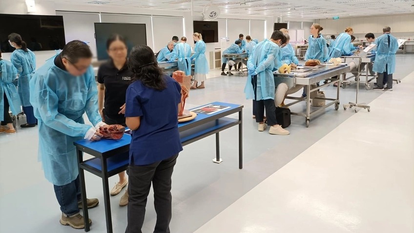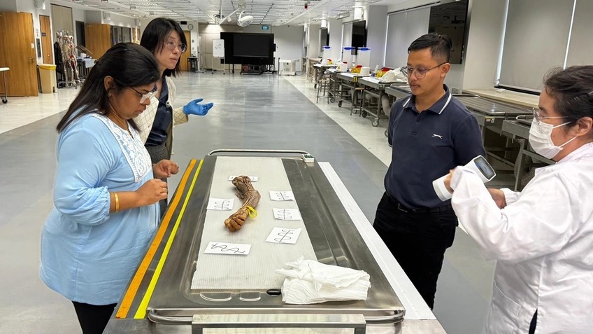 นักศึกษา NUS กำลังศึกษาโครงสร้างร่างกายมนุษย์โดยใช้แบบจำลองทางกายวิภาคศาสตร์ ภาพจาก NUS