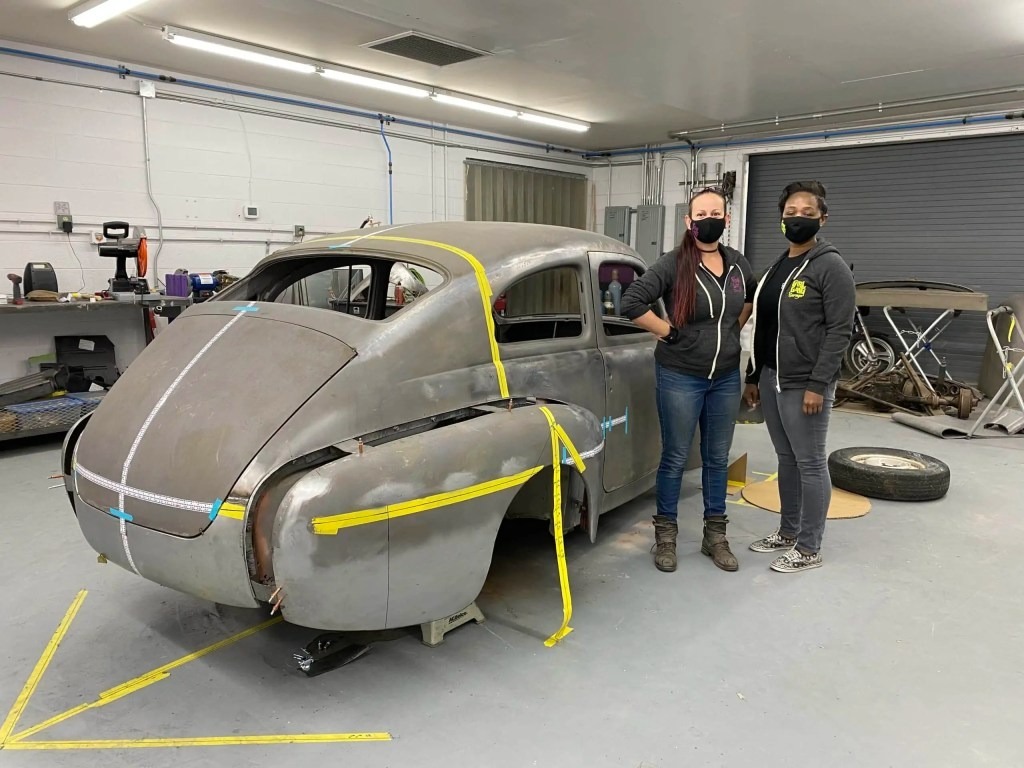 Lateiner และ Williams เจ้าของร่วมของ Girl Gang Garage ยืนอยู่ข้างตัวถังรถ Volvo PV544 ปี 1961 ที่ถูกตกแต่งใหม่