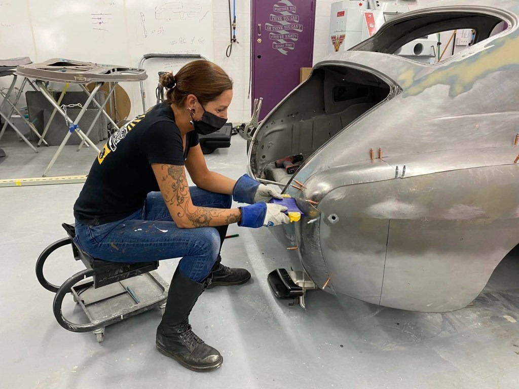 Latimer กำลังซ่อมบังโคลนหลังของรถ PV544 Volvo ที่ Girl Gang Garage